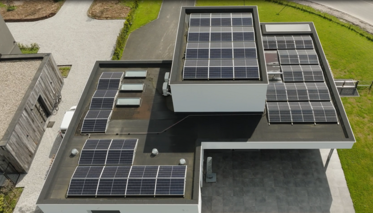 Het gezin woont in een vrijstaand, modern huis in een woonwijk. Het grote dak biedt plaats aan een indrukwekkende pv-installatie die voldoende elektriciteit opwekt om huishoudelijke toestellen, verwarming en de elektrische auto in belangrijke mate van stroom te voorzien. Wat niet direct nodig is, wordt opgeslagen voor later gebruik.