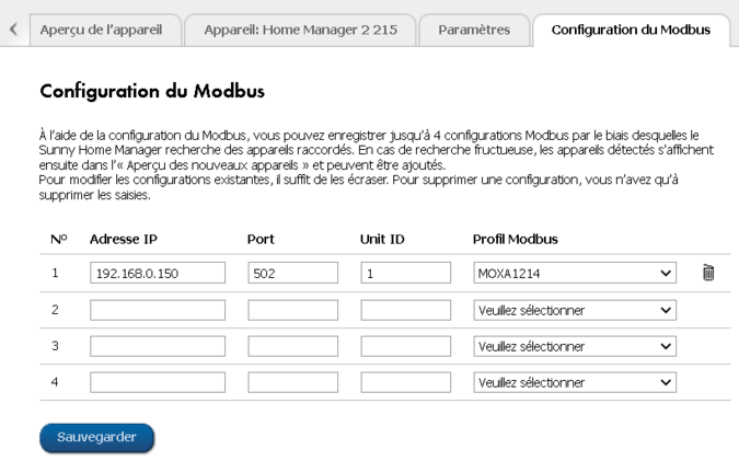 Lorsque le module d’I/O Moxa est correctement connecté, vous pouvez définir le module d’I/O dans le menu 'Caractéristiques' de Sunny Home Manager (également sous 'Aperçu de l’appareil'). Pour ce faire, sélectionnez la 'Configuration complex' en haut de la page au lieu de la 'Configuration simple'. Un nouvel onglet appelé 'Configuration du Modbus' apparaîtra alors. Ici, vous pouvez entrer l’adresse IP du module Moxa et sélectionner le profil.