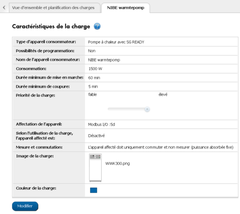 Vous pouvez ensuite terminer la configuration du système dans Sunny Portal. Ajoutez le 'Appareil Modbus' à l’installation via le menu 'Aperçu des nouveaux appareils' sous 'Configuration' → Aperçu de l’appareil. Ensuite, vous créez un nouveau consommateur et affectez ce consommateur au module d’I/O Modbus. Cette image montre un exemple :