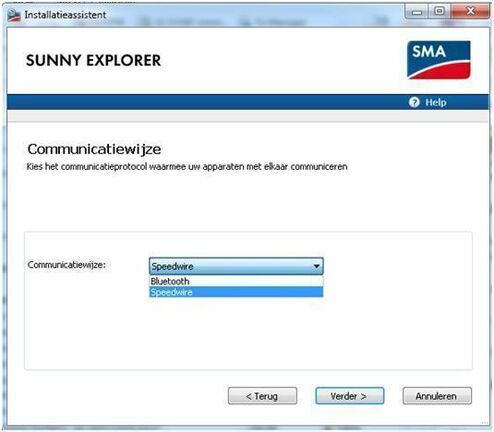 Eens de software gedownload en geïnstalleerd is kunt u een PV installatie aanmaken. Vervolgens kiest u welke soort verbinding u wenst te gebruiken om met de omvormer te communiceren. Hier hebt u dan de keuze uit een verbinding via Bluetooth of via Speedwire.