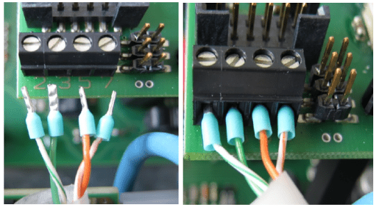 De 4 aderen moeten op het communicatiebordje van de omvormer worden aangebracht op de volgende manier:
