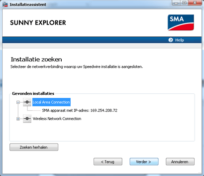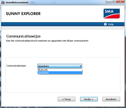 Qua communicatiewijze selecteert u Speedwire en u mag verbinding maken met het Local Area Network. (Uw computer moet ingesteld zijn op DHCP om de verbinding te kunnen maken)
