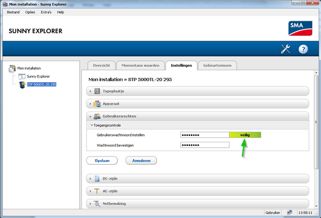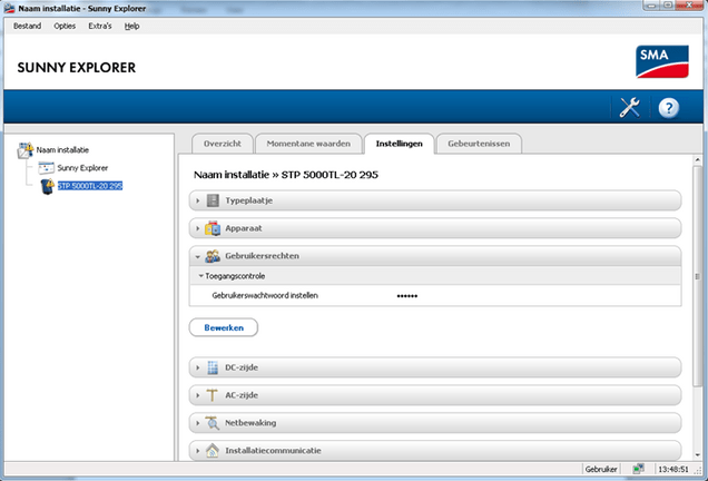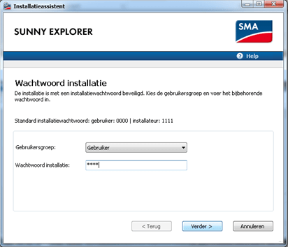 Sunny Explorer vraagt naar het wachtwoord van de installatie. Zoals u kunt zien, is het standaard wachtwoord als gebruiker: 0000. Dit wijzigt u best naar een veilig wachtwoord.