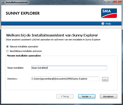 Open het programma Sunny Explorer. Duid aan: Nieuwe installatie aanmaken en klik op Verder.