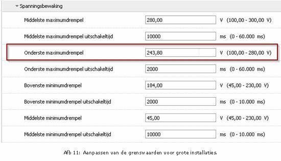 In Nederland zijn de limietwaarden verschillend voor grote en voor kleine installaties. Voor installaties kleiner of gelijk aan 3 x 16 A wordt de landnorm NEN EN 50438:2013 aangehouden en moet men geen instellingen wijzigen. Voor installaties groter dan 3 x 16 A wordt de Netcode Elektriciteit aangehouden. Hier werd in 2013 de bovengrens opgetrokken naar 253 V.