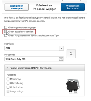 Kijk in Sunny Design Web om deze parameters op te zoeken. Ook oudere panelen zijn terug te vinden in onze database mits het uitvinken van ‘Alleen actuele PV-panelen’.