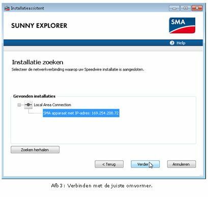 Voer een zoekopdracht uit met Sunny Explorer en selecteer de omvormer die verbonden is met je computer. In dit geval hebben we een rechtstreekse verbinding tussen omvormer en computer voorzien.