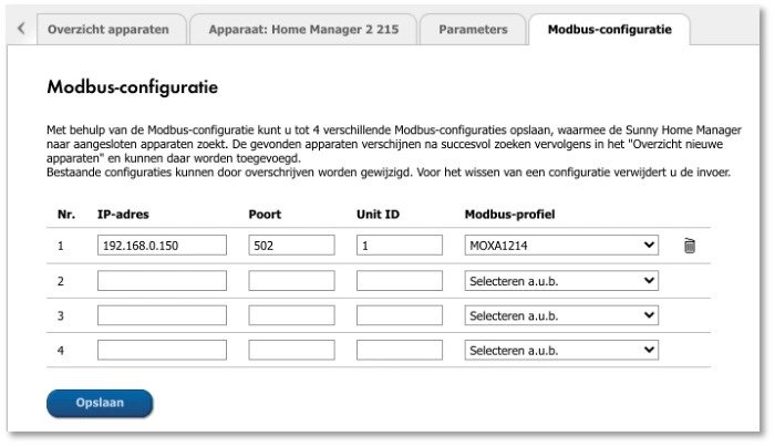 Wanneer de Moxa I/O module correct is aangesloten, kunt u in het menu ‘Eigenschappen’ van de Sunny Home Manager (ook te vinden onder ‘Overzicht Apparaten’) de I/O module instellen. Selecteer hiervoor bovenaan de pagina de ‘Uitgebreide configuratie’ in plaats van de ‘Eenvoudige configuratie’. Er verschijnt dan een nieuw tabblad met de naam ‘Modbus-configuratie’. Hier kunt u het IP-adres van de Moxa module invullen en het profiel selecteren.