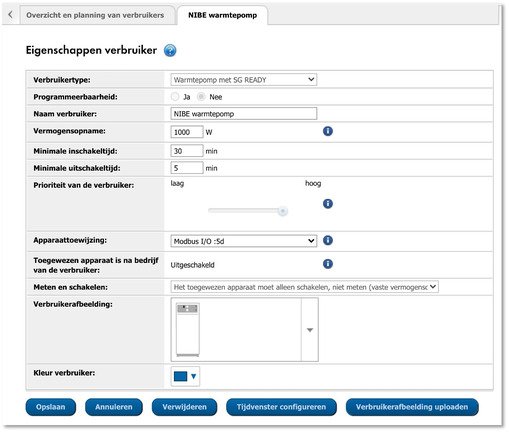 Vervolgens kunt u de configuratie van het systeem afronden in de Sunny Portal. Voeg het ‘Modbus apparaat’ toe aan de installatie via het menu ‘overzicht nieuwe apparaten’ onder ‘Configuratie’ —> ‘Overzicht apparaten’. Daarna maakt u een nieuwe verbruiker aan en wijst u deze verbruiker toe aan de Modbus I/O module. In deze afbeelding ziet u een voorbeeld: