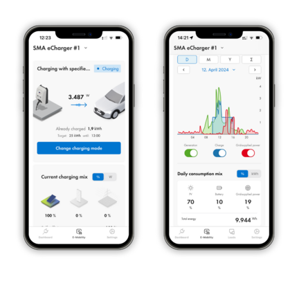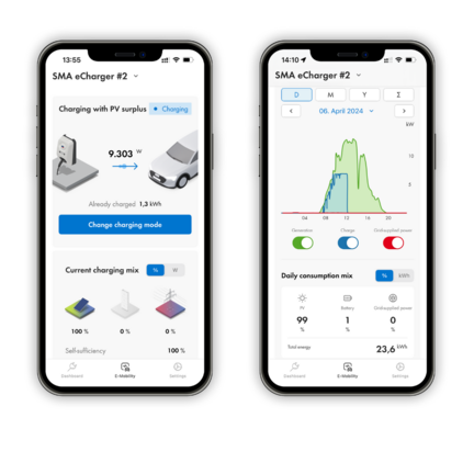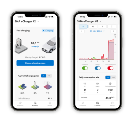 De intelligente laadmodi van de SMA eCharger passen zich aan de behoeften van de gebruiker aan door middel van een voorspellingsgebaseerde werking. Hij schakelt automatisch tussen de fasen en maakt zo opladen mogelijk op momenten met weinig zonne-energie voor kosteneffectieve mobiliteit, een hoger PV-zelfverbruik en een snellere terugverdientijd van het PV-systeem.